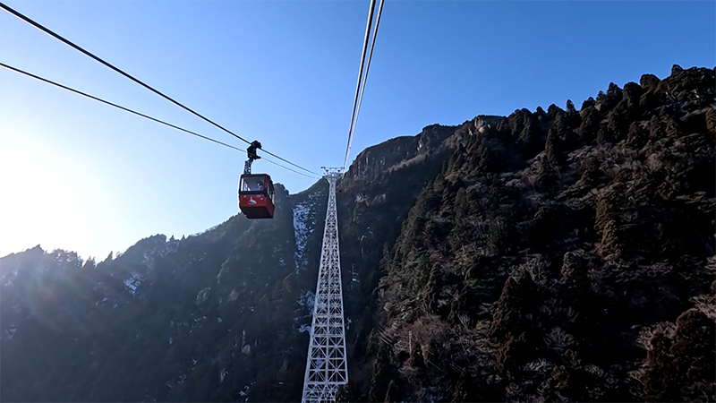 世界有数の規模を誇るロープウエイで、全長は2,161m、高低差が780mもあります。所要時間は片道で約15分。春はツツジが山を彩り、夏はアカトンボが舞い、10月中旬から11月下旬にかけて紅葉が楽しめます。冬は「樹氷」が見られます。ロープウェイから山肌を見下ろすと、特別天然記念物の「ニホンカモシカ」を見られることもあります。
