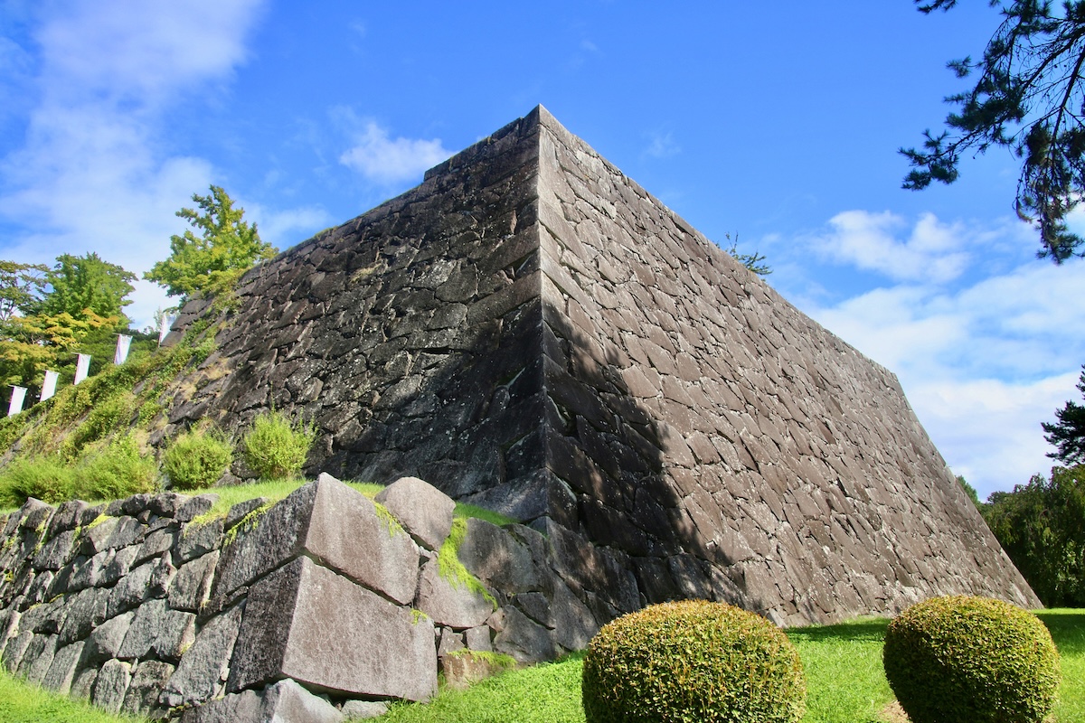 最大の特徴は、東北地方では珍しい、切込接(きりこみはぎ)や打込接(うちこみはぎ)といった技法を組み合わせた美しい石垣です。淡い白みを帯びた花崗岩の石垣が重厚な景観を作り出しています。
