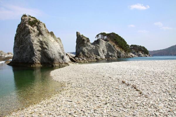 宮古市に位置する浄土ヶ浜は、三陸復興国立公園を代表する景勝地です。約5200万年前の火山活動によって形成されたといわれる、鋭く尖った白い流紋岩が海から突き出す独特の景観が最大の特徴です。