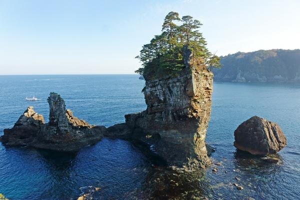 長い年月をかけた波の侵食により、根元が細く削られた独特の形状を維持。遊歩道からは、打ち寄せる荒波が岩に砕ける迫力ある光景を望むことができます。震災の津波を耐え抜いた「復興を見守る希望のシンボル」としても知られ、地域の誇りとしても親しまれています。