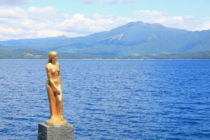 遊覧船を下船したら、湖畔西側の「たつこ像」へ。永遠の若さと美しさを願って湖神になったというたつこ伝説にちなみ、黄金色の像が湖面に向かって立っています。湖の瑠璃色との対比が印象的で、田沢湖を象徴する景観のひとつです。