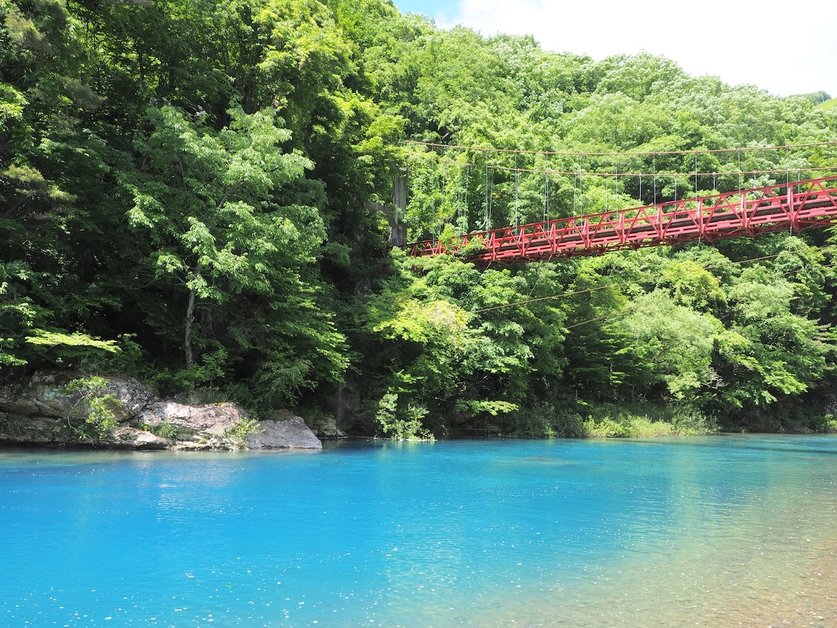 現在は遊歩道が整備されており、歴史ある吊り橋の「神の岩橋」からは、独特なエメラルドグリーンの川面を一望できます。特に「回顧の滝(みかえりのたき)」は落差が大きく、渓谷屈指のビュースポットとして知られています。奇岩や急流が続く景観は学術的にも価値があり、県立自然公園に指定されています。