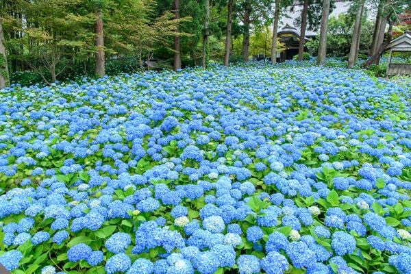雲昌寺は、男鹿北海岸に位置し、副住職が15年以上の歳月をかけて一株から手作業で増やした、約1,500株以上のあじさいが境内を埋め尽くす寺院です。最大の特徴は、独自の育成方法によって密集して咲くあじさいの密度の高さと、青一色に統一された景観にあります。