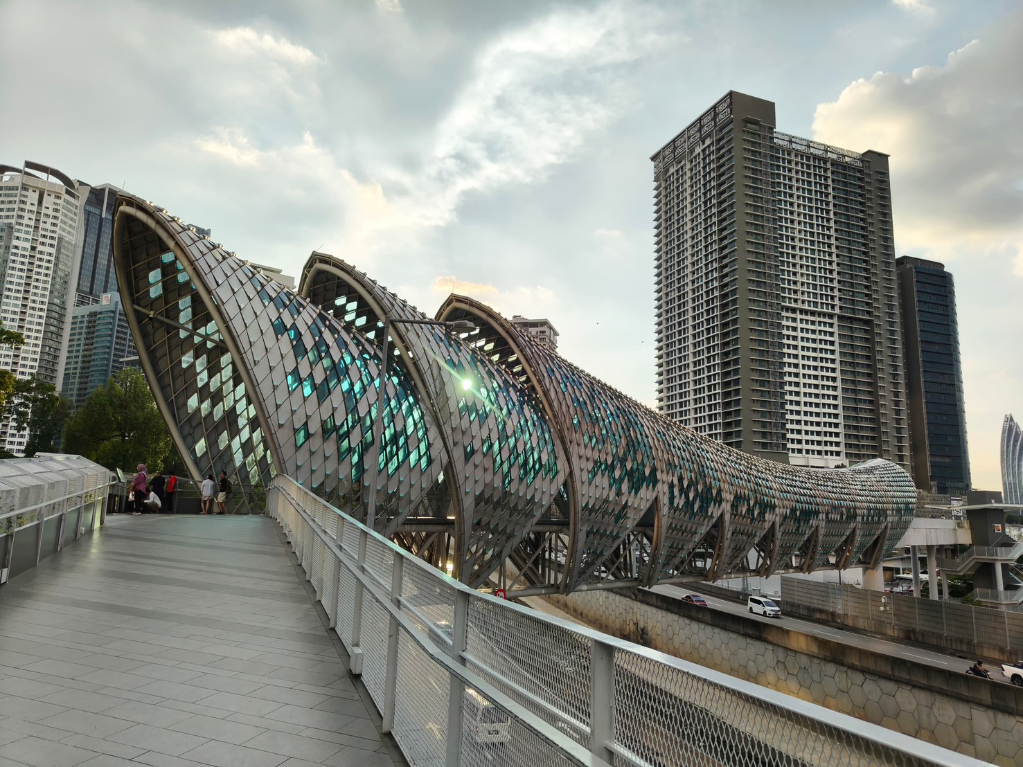 2020年に完成したばかりの新名所「Pintasan Saloma(サロマリンクブリッジ) 」は、クアラルンプールを代表する観光スポットとして人気を博しています。これは長さ約370メートルを誇る歩行者専用橋。トーチ(たいまつ)をイメージしたらせん状にねじれるフォルムは、他に類を見ない近未来的なデザインです。