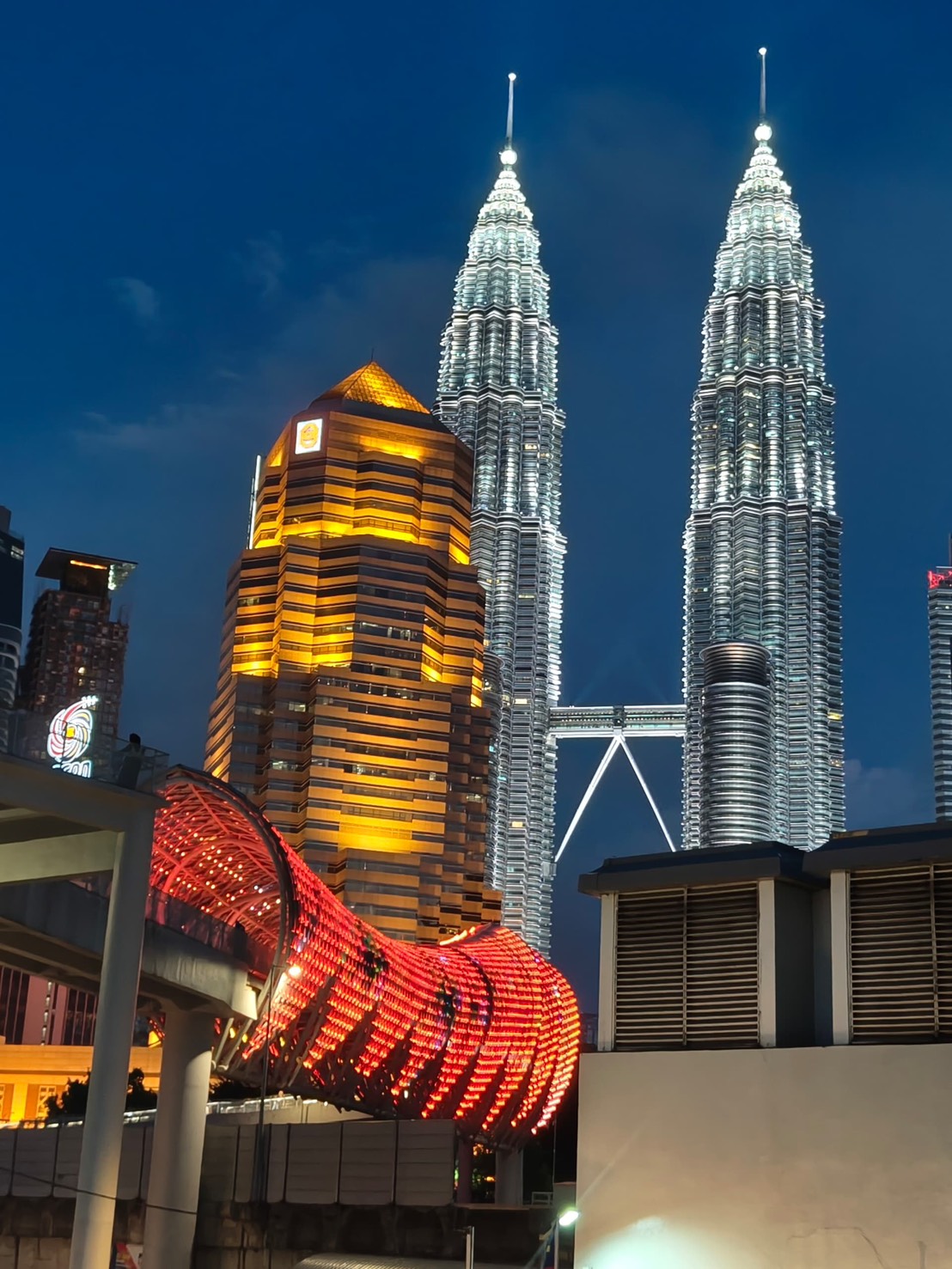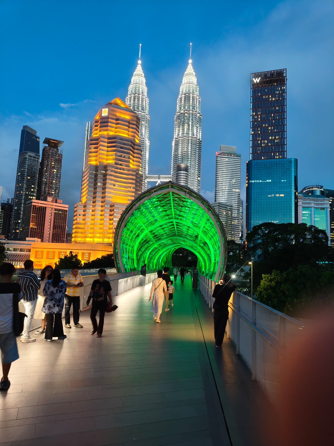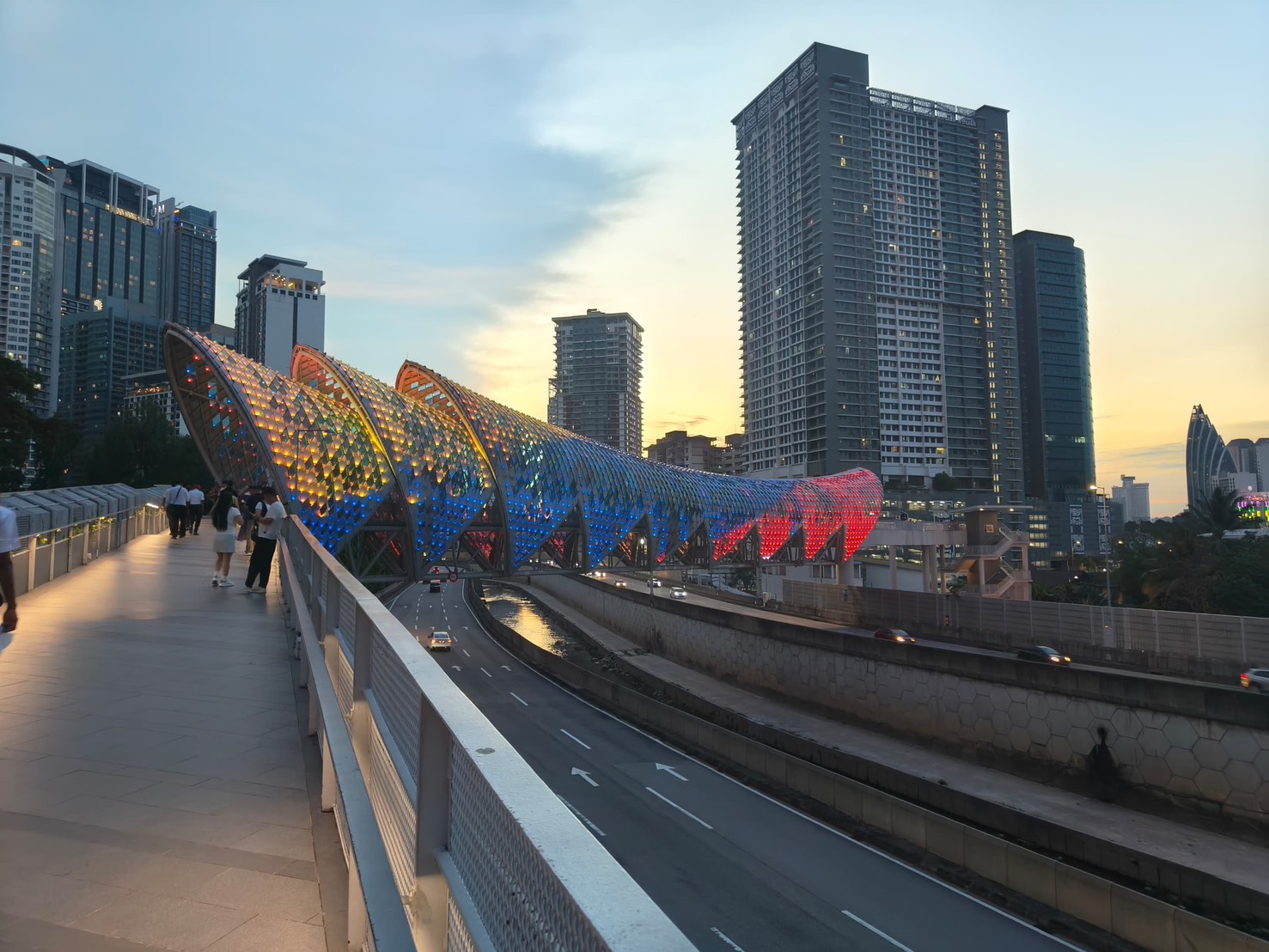 Pintasan Salomaの魅力は、何といっても “昼と夜でまったく異なる雰囲気が楽しめる” ところ。夕暮れどき、橋が少しずつライトアップされていくさまは、思わず息をのむほど幻想的な光景です。天気が良い日に見られる「オレンジ色に染まりゆくペトロナスツインタワー(クアラルンプールのシンボル)」は、クアラルンプールらしさを凝縮したワンシーンといえます。
