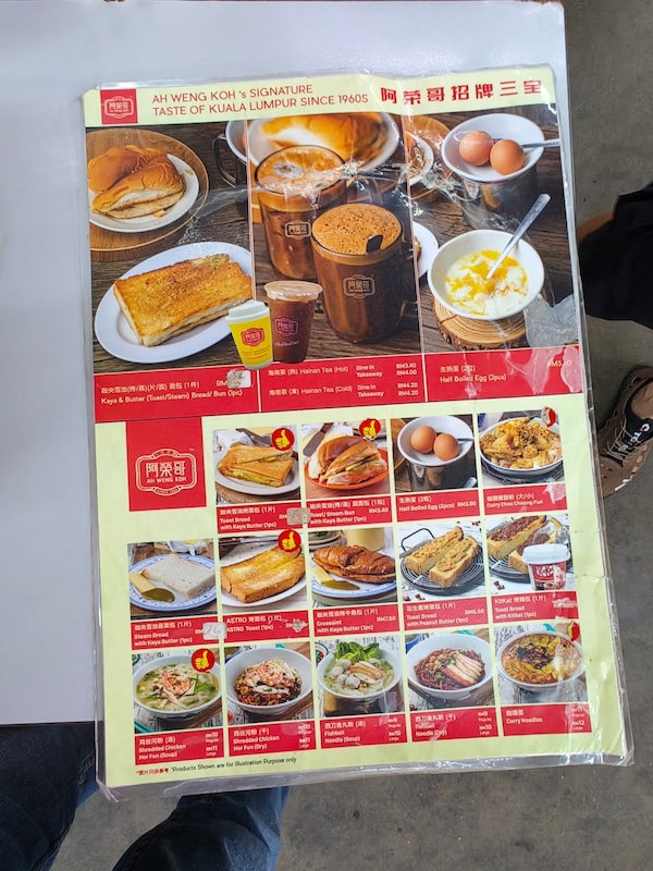 「Ah Weng Koh Hainan Tea & Coffee(阿榮哥海南茶・コーヒー)」は、クアラルンプールの ICC Pudu フードコート内にある、伝統的な海南風コピティアム(中華系喫茶店)スタイルの朝食店です。40年以上の歴史をもつ老舗で、地元住民や通勤者にとって朝の定番スポットとなっています。