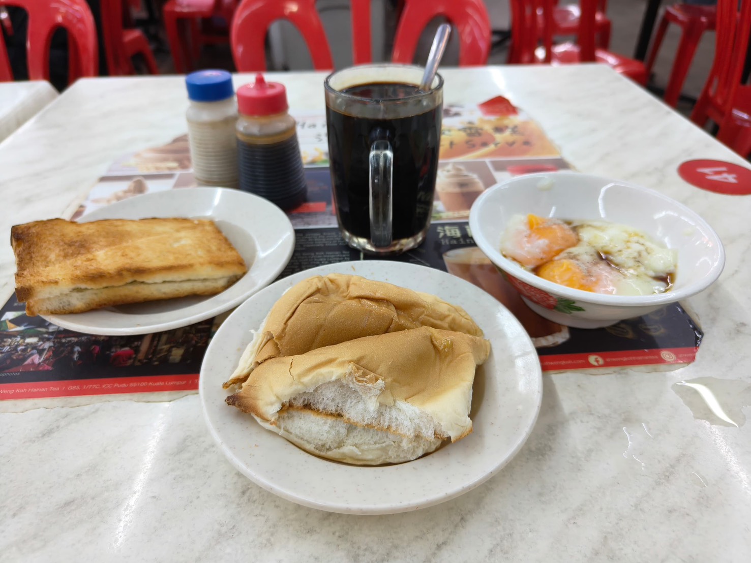 ここではマレーシアの朝食文化を象徴する『カヤトースト』が海南茶、Cham(茶+コーヒー)、半熟卵などとセットで提供され、気軽にローカル朝食を体験できます。