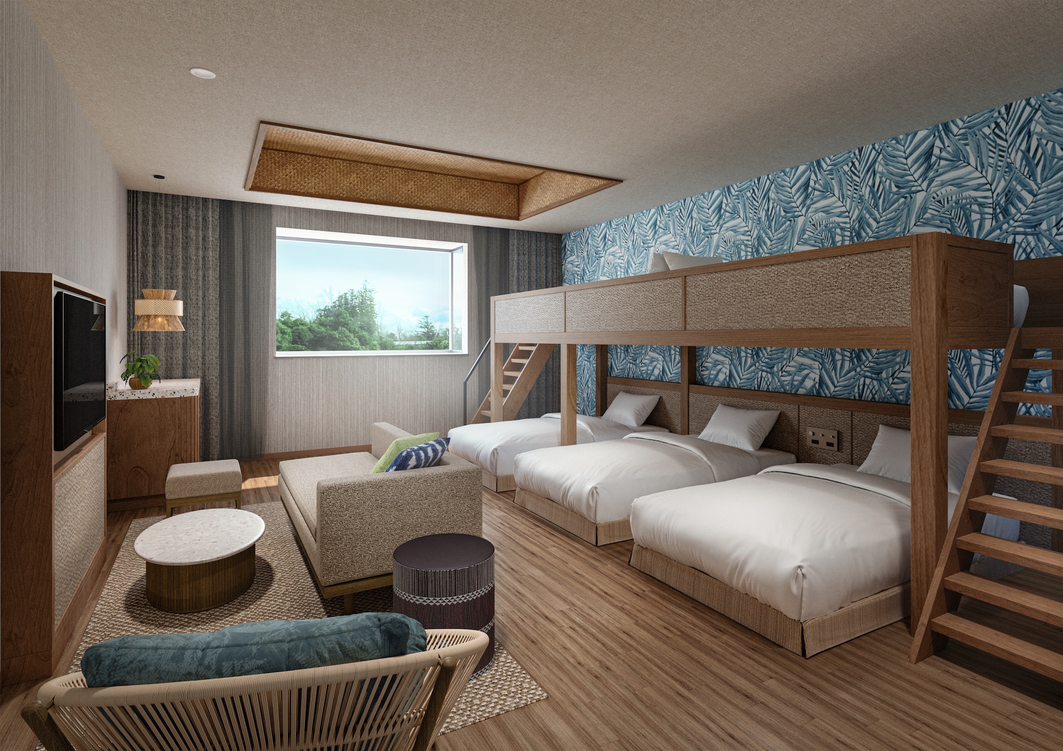 ウォーターパークに一番近いホテル「ウイルポート」では、小上がりの部屋を一部フォースの洋室に改装予定。ファミリールームの充実に加えてアトリウムもフル改装し、よりリゾート感溢れる空間に生まれ変わります。
