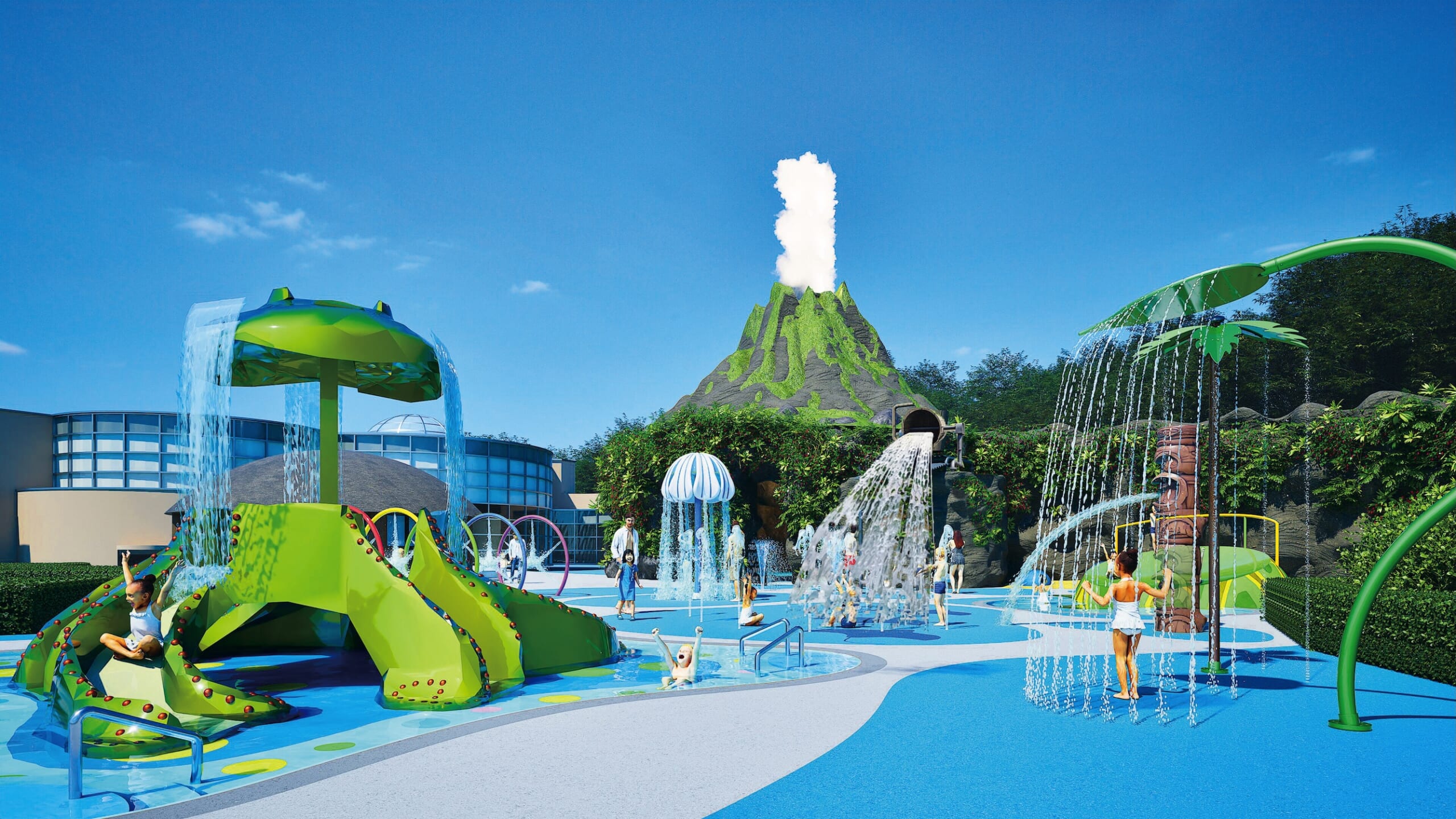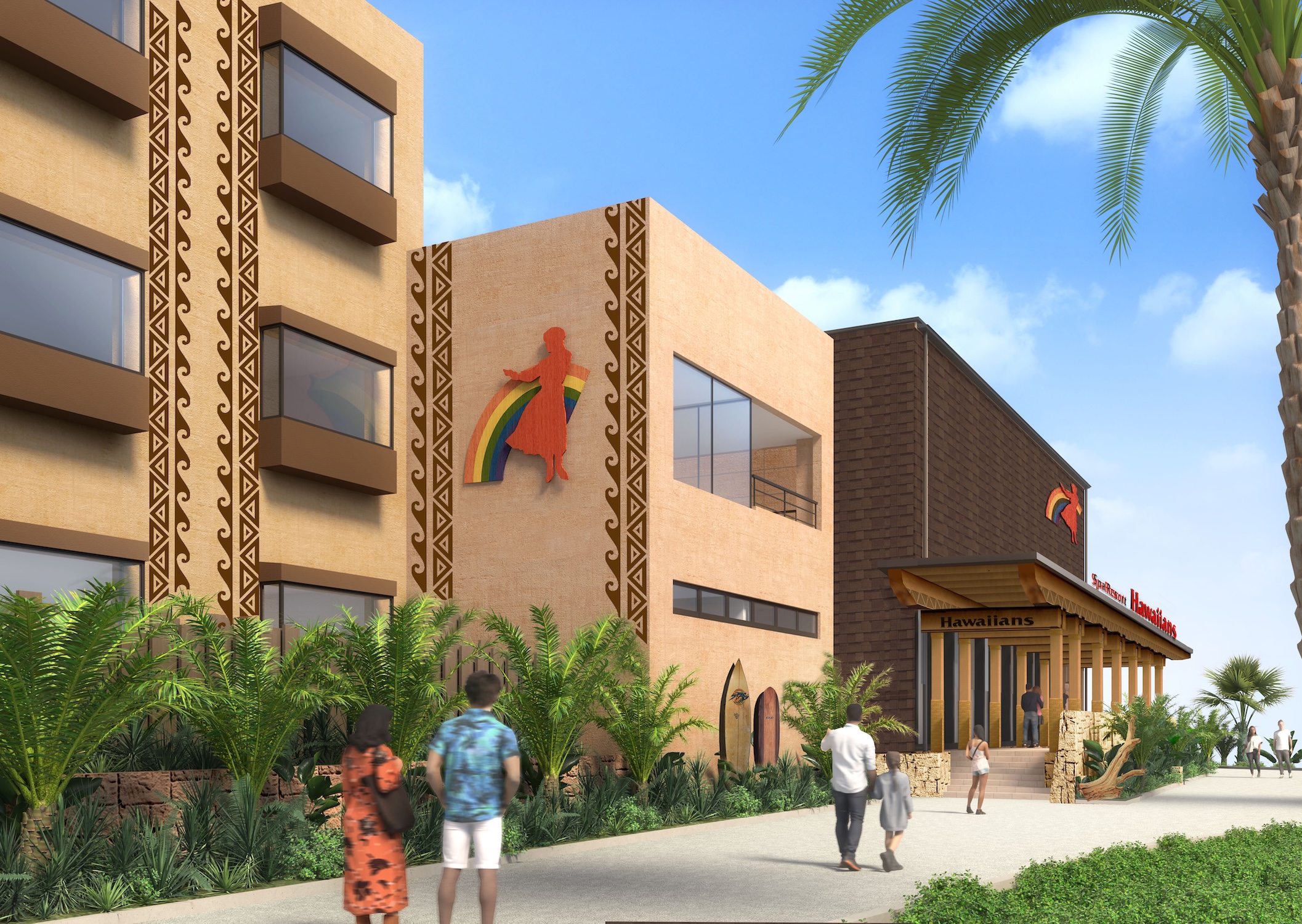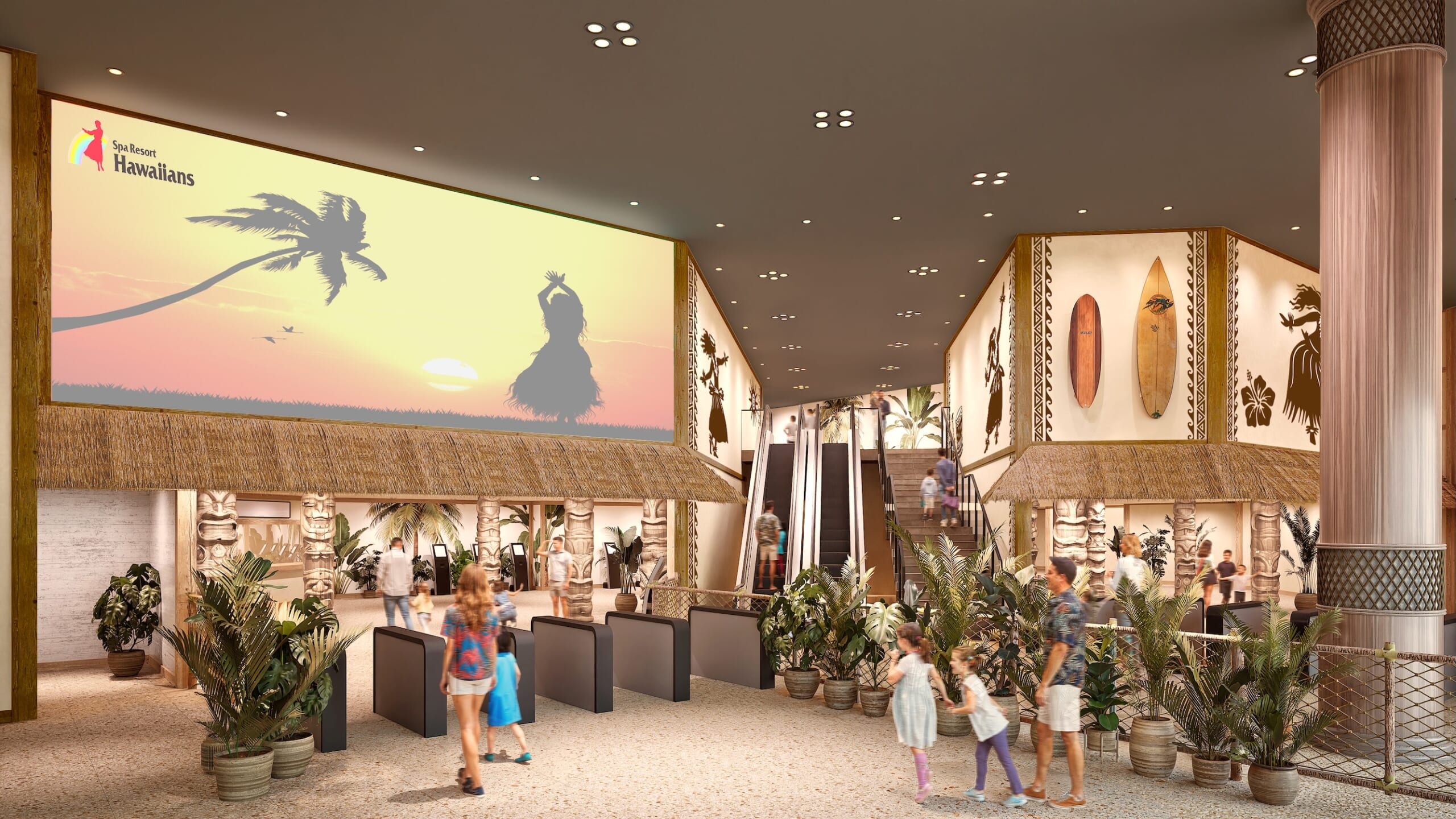 「ウォーターパーク」はエントランスの変更、入場から精算までを生体認証で行える仕組みの導入により、入場までの動線がよりスムーズに。新たなシンボルとして茅葺の大屋根を新設し、植栽や自然素材に見立てた素材を使用するなど、自然と調和したオールドハワイの世界観を創出します。