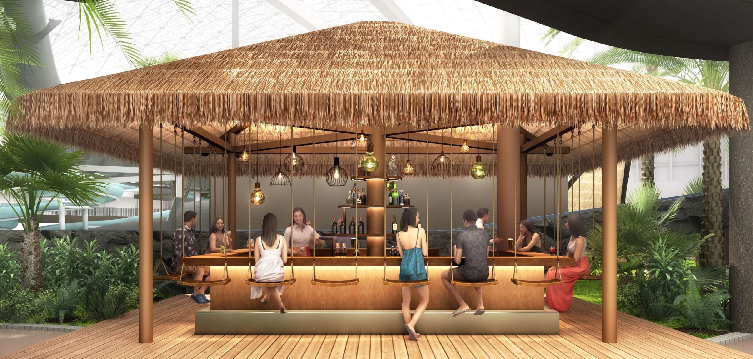 こだわりの「ティキバー」は、ブランコに座りながらカクテルを楽しめるという、ハワイではおなじみのスタイル。日中はスイーツを楽しんだり、泳いだ合間に休憩したりと、プールサイドの憩いの場として活躍が期待されます。