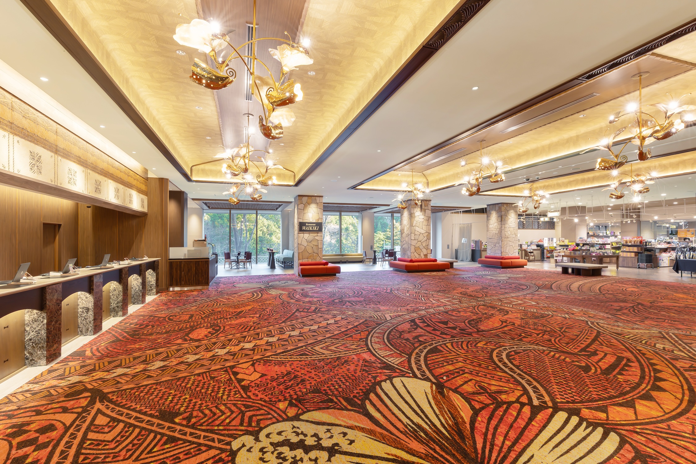 合わせて1階ロビーは、絨毯やチェックインカウンターのデザインを一新。ポリネシアの伝統模様を大胆に配置したいっぽう、照明などはこれまで使用していたものをそのまま残し、レトロモダンな空間を演出しています。到着した瞬間から「ノスタルジックなハワイ」の雰囲気を感じられることでしょう。