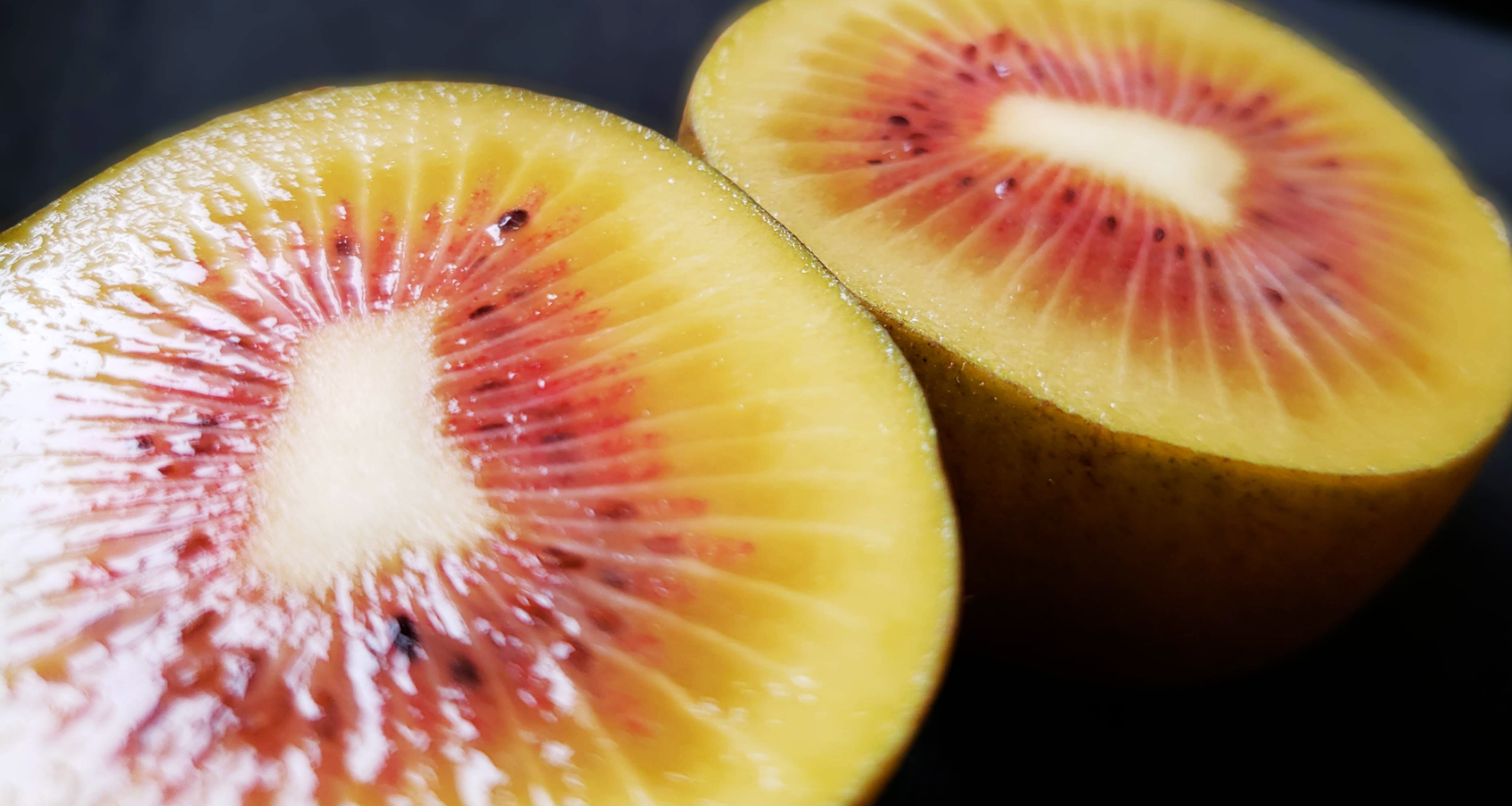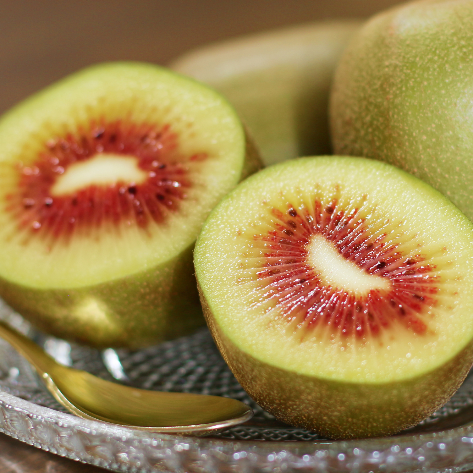 果肉の中心部が赤い「レインボーレッドⓇキウイ」は、ひときわ甘く、酸味の少ないキウイとして注目が集まっています。キウイフルーツの中でも新しい品種で、病気に弱く栽培が難しい、皮が薄くて傷つきやすく繊細などの理由から、限られた生産者だけが育てている希少なフルーツです。有名百貨店でも滅多に見られません。