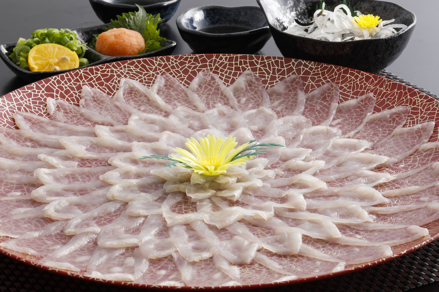 【2】味と食感がたまらない! ふぐ刺しと白子、湯引き皮に、ひれ酒用ふぐひれ