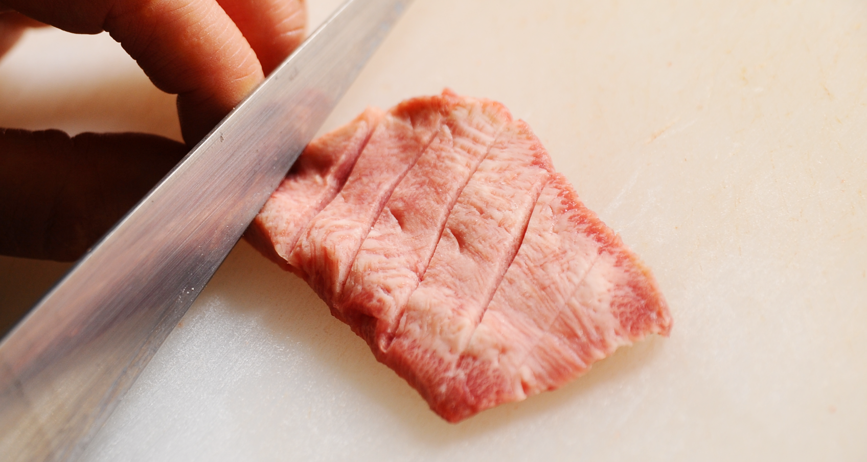 『司』の「牛タン」はオーナーが厳選したオーストラリア産。肉質が固い舌の先の部分は惜しみなく取り除き、柔らかい部分だけを提供しています。1枚は食べ応えのある8mmに切ってから、柔らかく食べられるように切れ目を入れていきます。カットする作業は1枚1枚、職人の手によるもの。その後、やはり1枚ずつ塩をふりかけて3日間じっくりエイジング(熟成)を行います。内部の水分がほどよく抜け、内部に塩分が浸透して旨みが凝縮します。