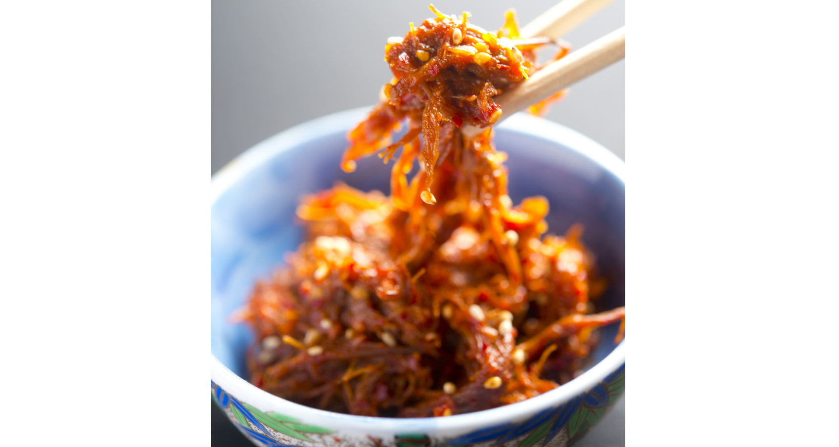 特製の辛みだれとあえたピリ辛佃煮です。マイルドな辛さでごはんやお酒が進む味わいです。