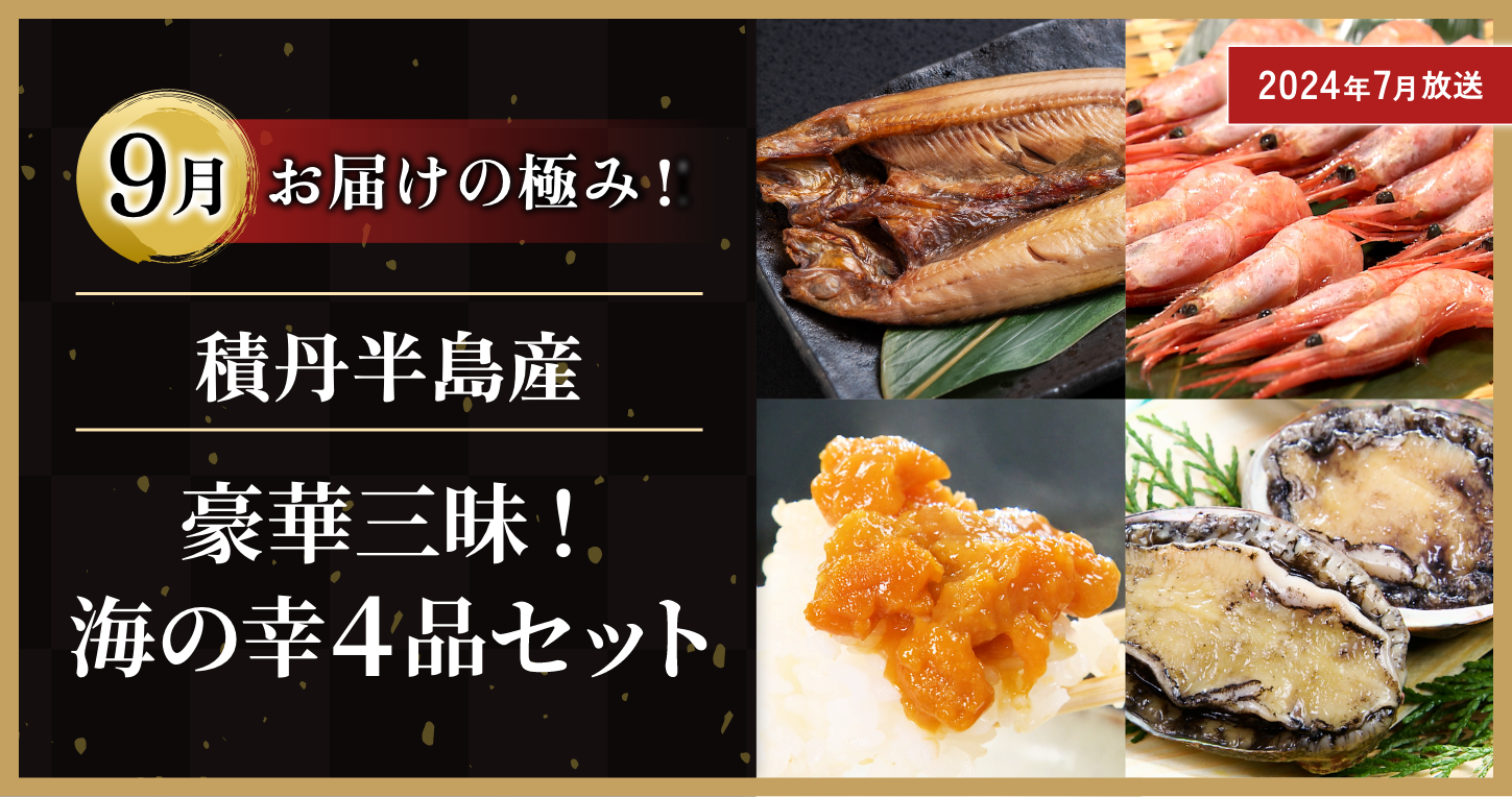 「積丹ブルー」と呼ばれる息をのむように美しく澄み切った海、積丹半島から豪華な海の幸を4品セットでお届けします。