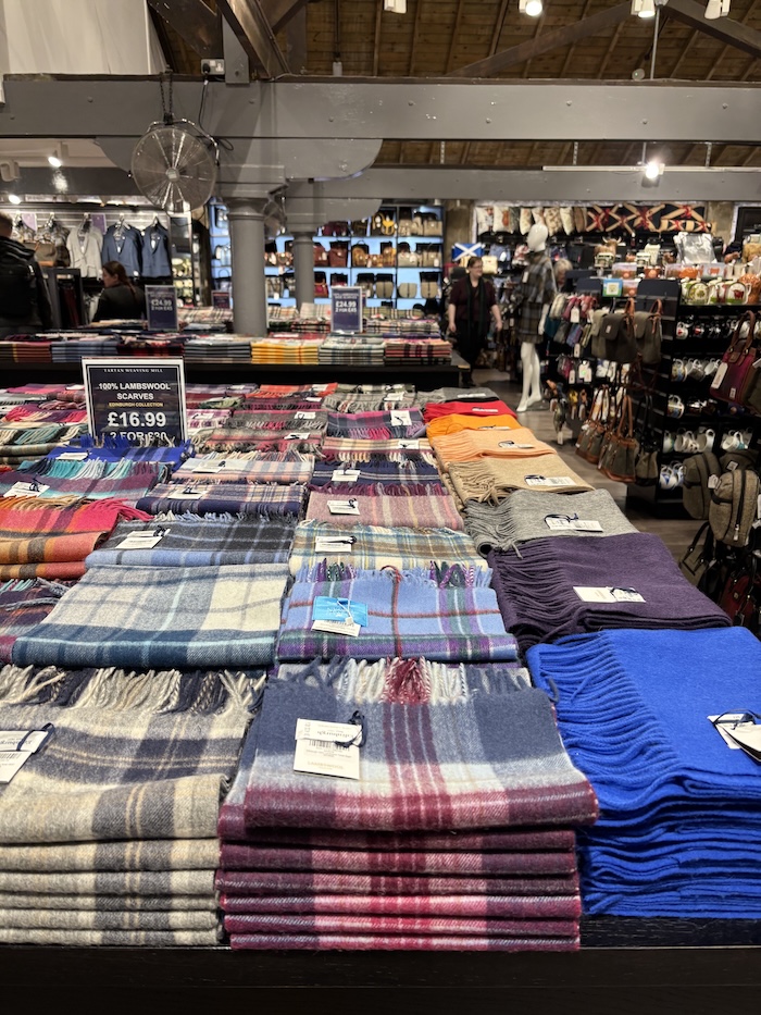 これらのお土産が数多く揃うお店が、エディンバラ城のすぐそば、メインストリートのロイヤルマイルにあります。Tartan Weaving Mill and Exhibition(タータン・ウィーヴィング・ミル・アンド・エキシビション)は市内屈指の品揃えを誇るお土産ショップ。5階建ての建物には、スコットランドの特産品であるカシミアやツイードの小物をはじめ、ウール製品やニット製品など、豊富なお土産品が揃います。多数のブランドが一挙に見れることからも観光客に人気で、いつも大勢の人で賑わっているお店です。おもちゃや文房具などの雑貨も取り扱っています。