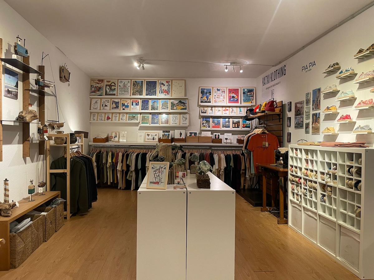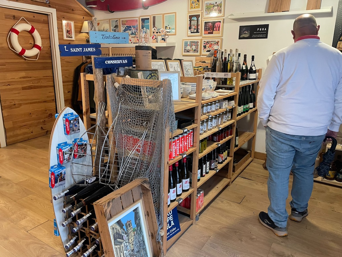 「海の恵み」をテーマにしたお店で、店内には高品質な魚の缶詰や地元名物チャコリのワイン、魚用グリル網、マリンテイストのアパレルやインテリア、さらにはバスク地方の職人やアーティストによる作品まで、多彩なアイテムが並びます。