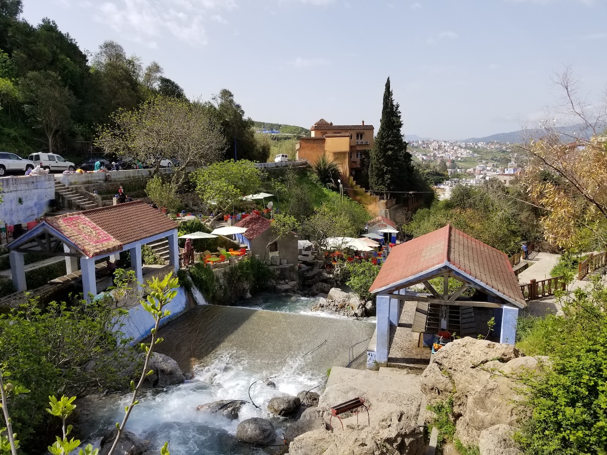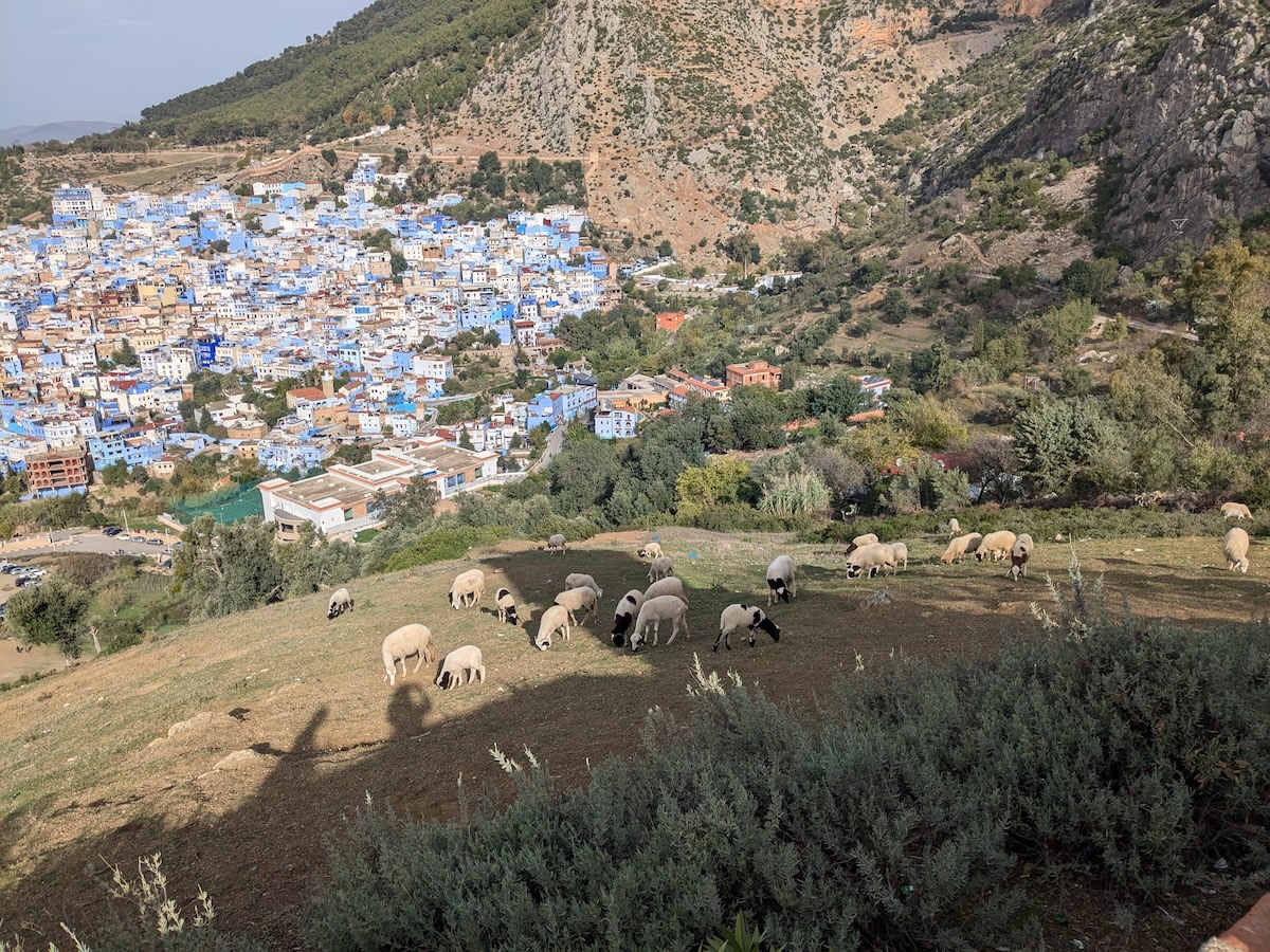 山頂まではゆっくり歩いても約30分。山道には坂や階段がありますが、途中まででもじゅうぶんに美しい景色が楽しめるため、体力に自信がない人でも安心です。中腹あたりから見る景色にも迫力があり、道中では羊の群れに出会うことも。自然とともにあるシャウエンらしさを感じられるのも魅力のひとつです。天気の良い日には簡易的なカフェが出ていることもあり、景色を眺めながら一息つくのもおすすめです。