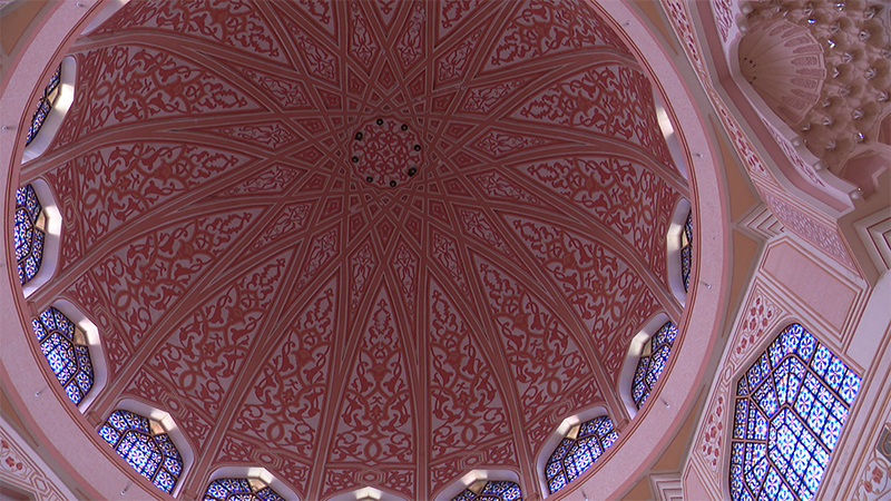 湖のほとりに建つ、ピンク色の幻想的なモスク。