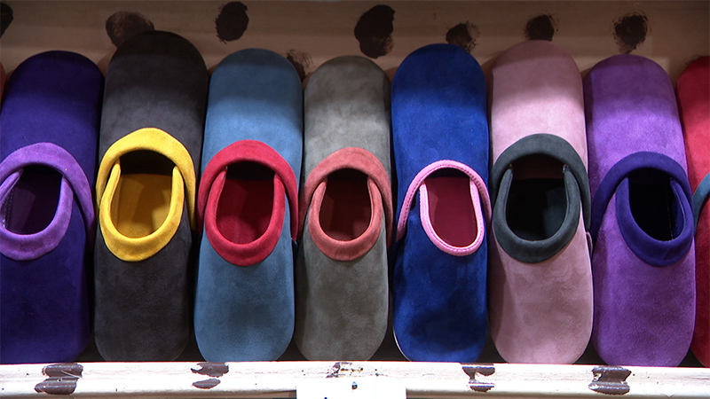 モロッコ伝統のスリッパ・バブーシュのお店。天然の革を一つ一つ丁寧に手作業で縫って作られる。