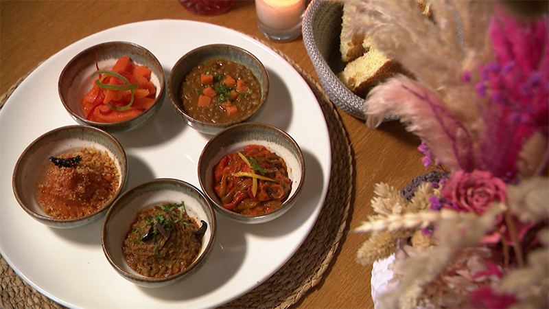 - そら豆のビサラ 20DH(約300円)、イチジクとかぼちゃのタジン 50DH(約800円)