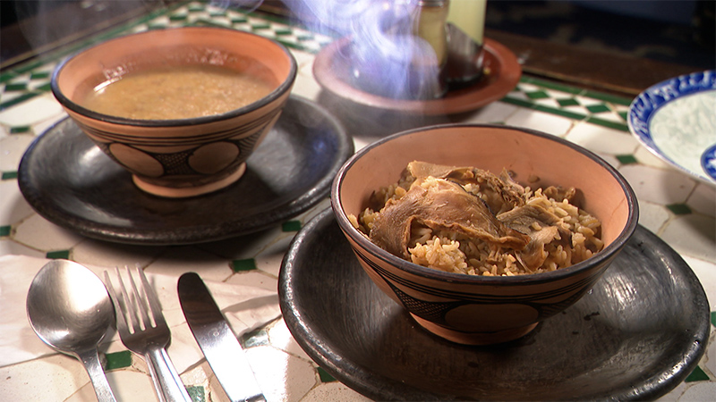 松茸のタジン 1,00DH(1,700円)、松茸ご飯 50DH(約800円)