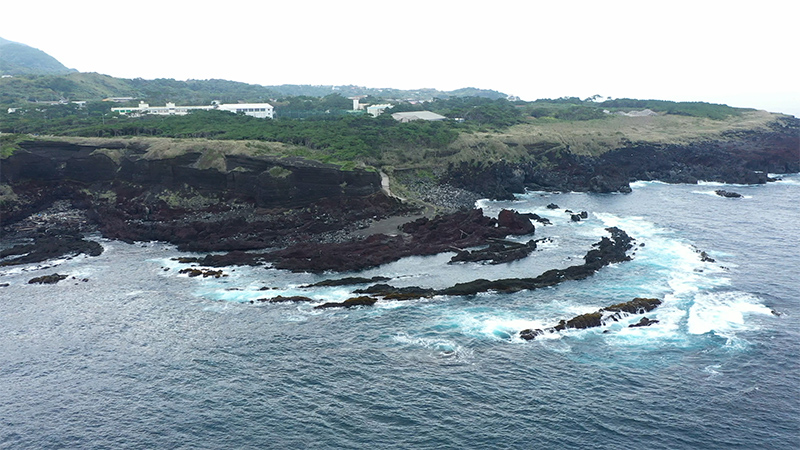 数千年前、三原山の噴火の溶岩流で生まれた荒々しい海岸。海に向かって弧を描くように岩肌が広がる。