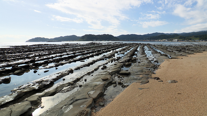 約700万年前に海中でできた地層が傾いて隆起し、長い間波に洗われてできた形。干潮時によく見える。