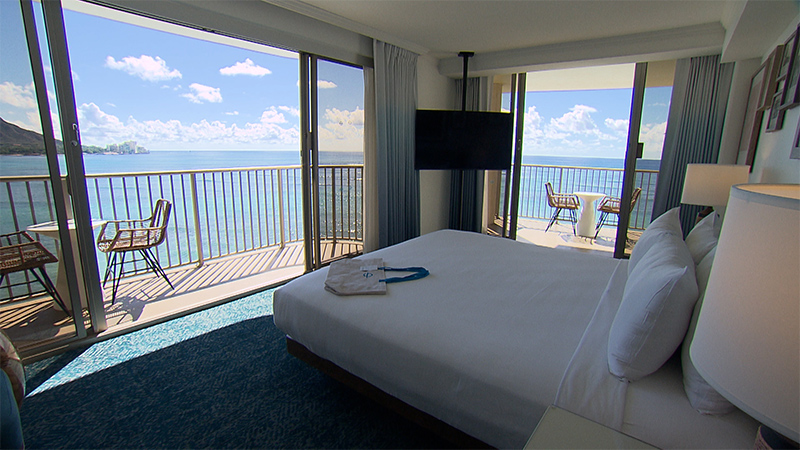 2023年に全館リニューアルオープンしたラグジュアリーホテル。ロビーやプールサイドをはじめ、館内はハワイの歴史や文化を感じられる造りになっている。全658室あるお部屋はタイプも景色もさまざま。オーシャンビューはもちろん、広々としたリビングルーム付きのスイートではダイヤモンドヘッドビューが楽しめる。