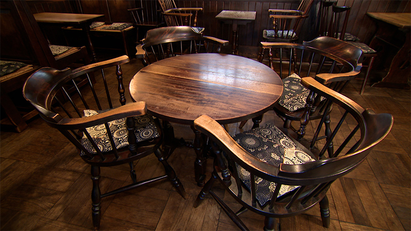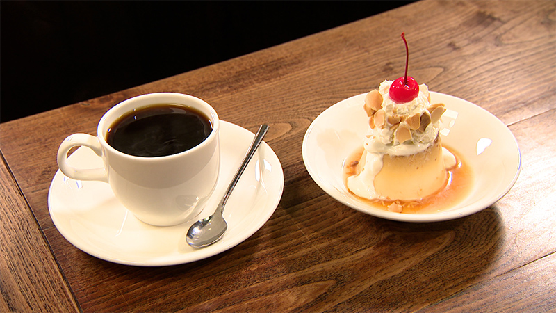 1956年の創業当時から松本民芸家具のテーブルやイス、コーヒーもそのまま受け継がれている。
