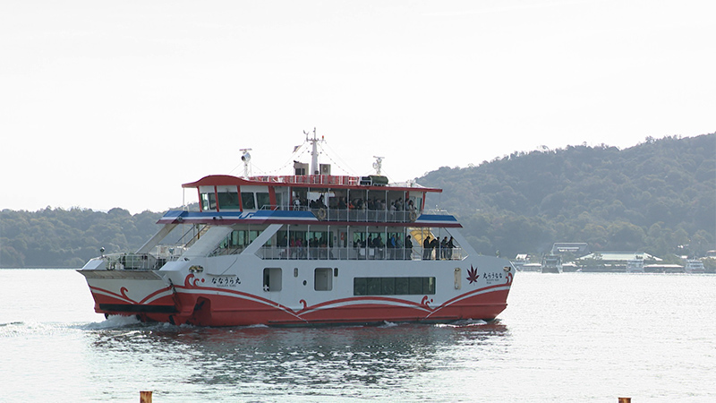 宮島口と宮島を約10分で結ぶ定期船で、世界遺産・宮島への玄関口となっています。JR西日本宮島フェリーならではの魅力が、大鳥居を手前に嚴島神社を正面に望める「大鳥居便」です。大鳥居と嚴島神社をツーショットで撮影できる絶好のアングルが楽しめます。
