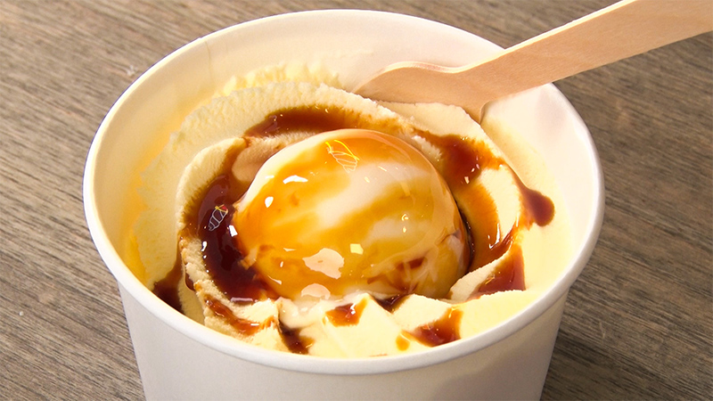 アイスの甘さと醤油のほのかな辛さ、温泉たまごの濃厚な味わいがやみつきになる商品。