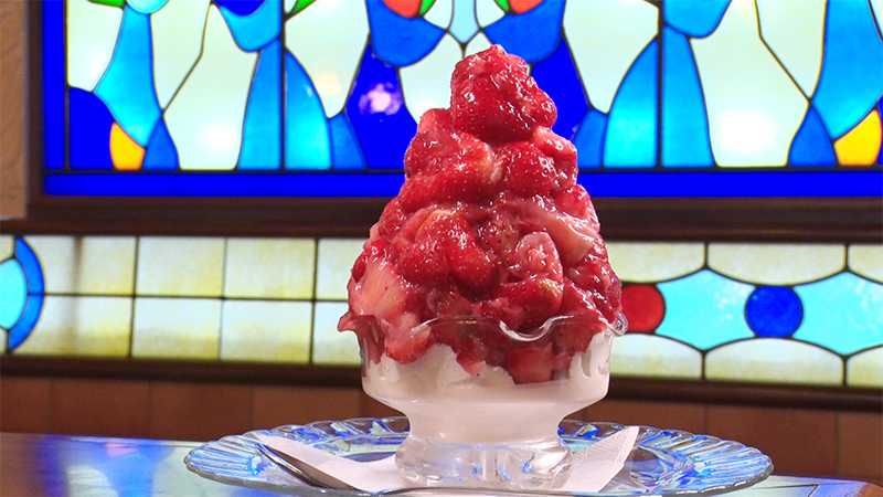 市外にはほとんど出回らないという気仙沼イチゴをふんだんに使用したイチゴババロアは毎年2~5月頃に販売される喫茶マンボの看板メニューで、これを求め休日には行列ができる。